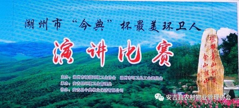2018年7月27日,由湖州市城镇环境卫生协会、湖州市环卫处工会委员会主办,安吉县环境卫生管理处承办,安吉县今典物业保洁有限公司协办的“湖州市‘今典杯‘最美环卫人―演讲比赛”在安吉顺利落下帷幕。应湖州市环境卫生协会梅剑理事长、徐永芳秘书长邀请,安吉县美丽乡村长效办喻凯主任、安吉县环卫所王双喜所长现场观摩了整个赛事。